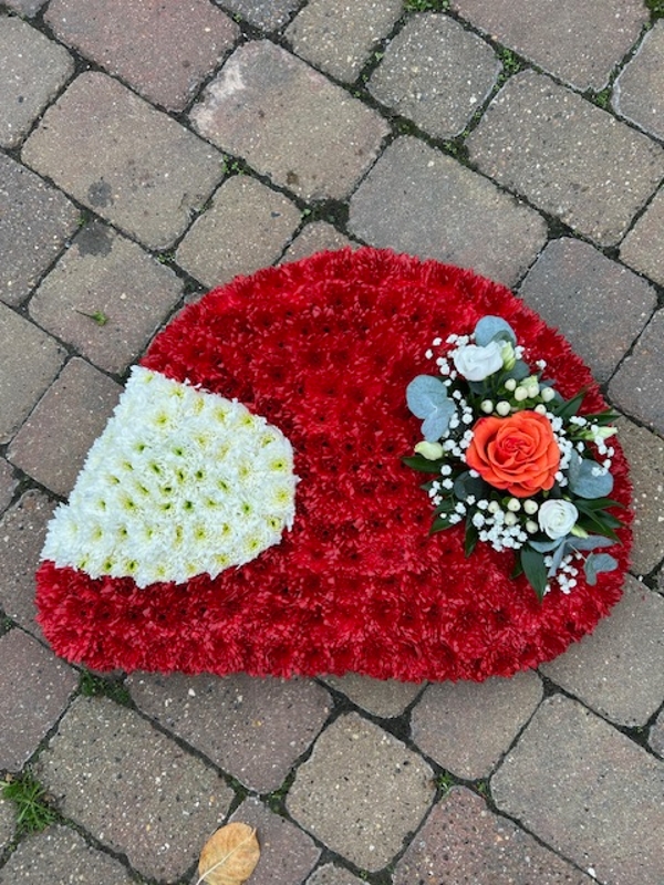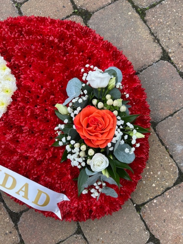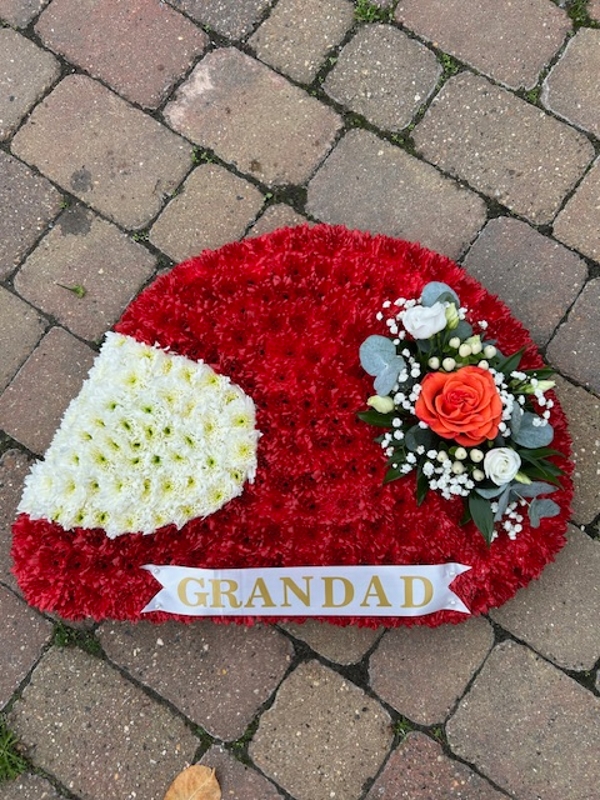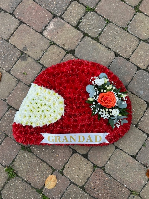 A beautiful design of a 2D Crash Helmet, made using white chrysanthemums which have been spray painted in Red. Other colours can be arranged. Includes a spray of flowers. You can add lettering of choice.